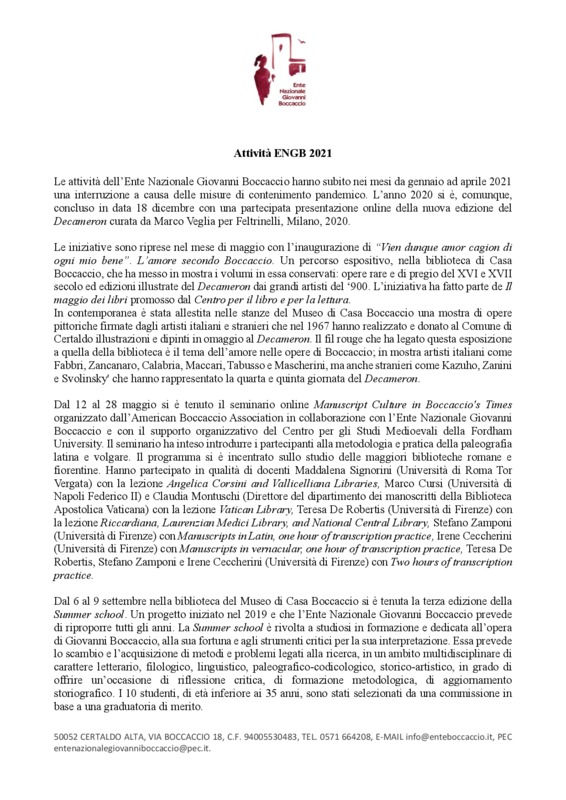Attività dell'Ente Nazionale Giovanni Boccaccio svolta nel corso dell'anno 2021
