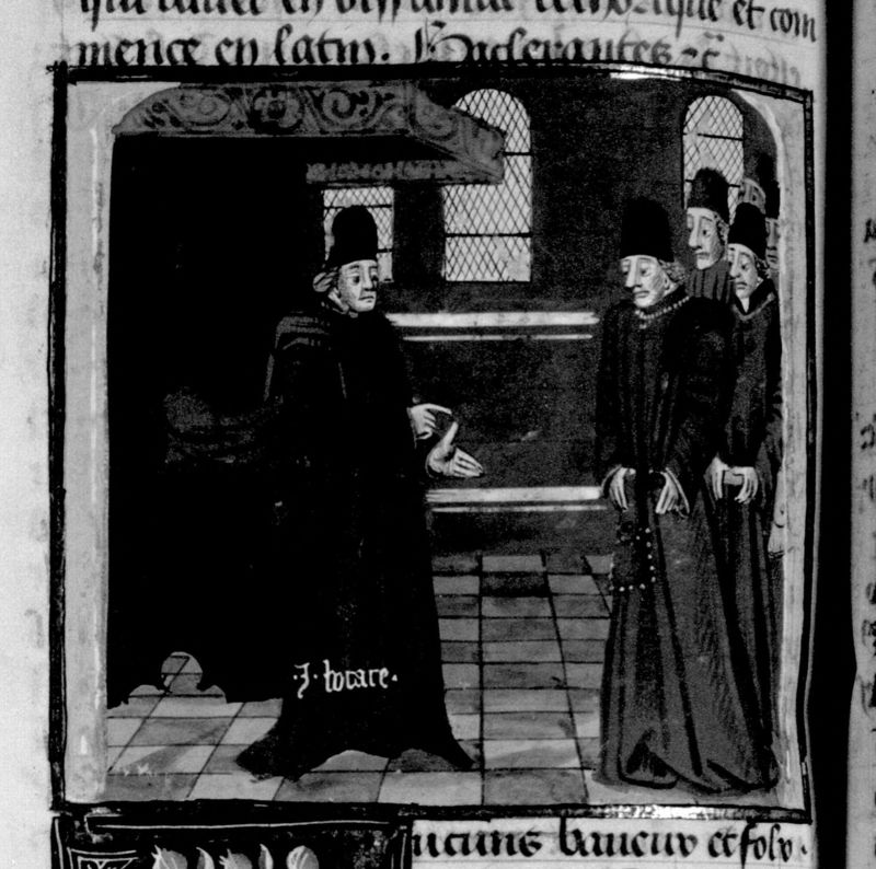 Parigi, Bibliothèque Nationale de France, Fr. 230, f. 208r. Il copista del manoscritto è P. Droulin. Giovanni Boccaccio incontra alcuni Ebrei.