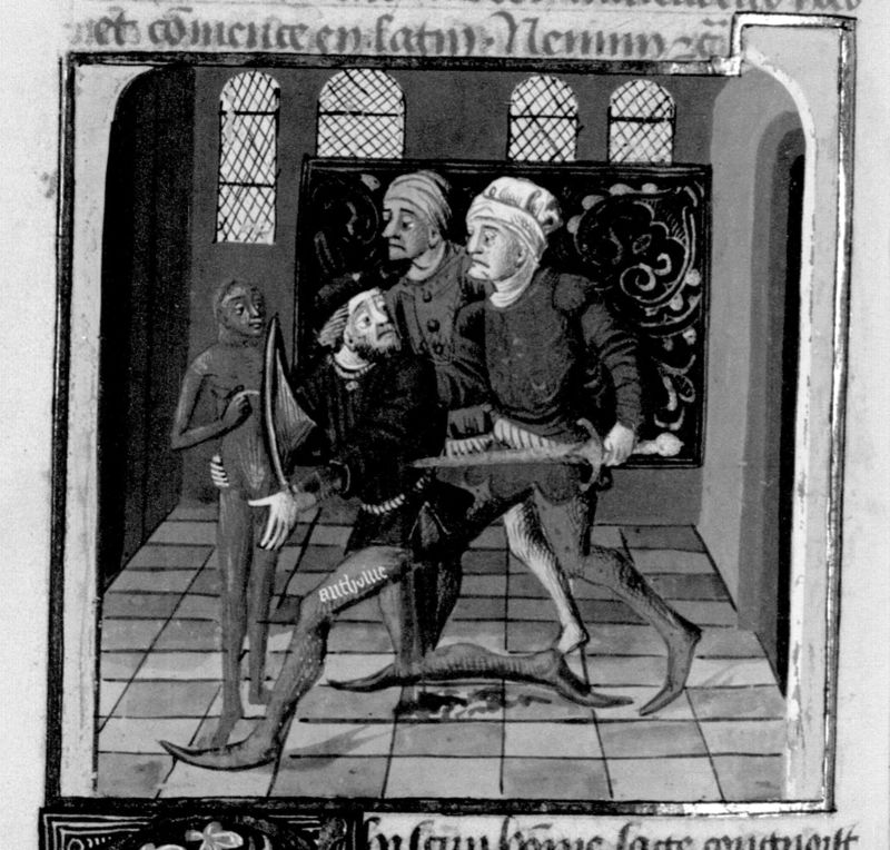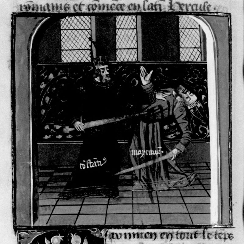 Parigi, Bibliothèque Nationale de France, Fr. 230, f. 220v. Il copista del manoscritto è P. Droulin. Massimiano Erculeo viene ucciso da Costantino.