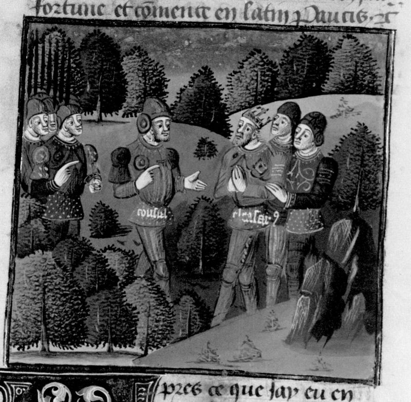 Parigi, Bibliothèque Nationale de France, Fr. 230, f. 218r. Il copista del manoscritto è P. Droulin. Zenobia si arrende all'imperatore Aureliano.