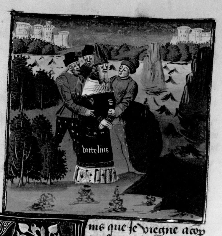 Parigi, Bibliothèque Nationale de France, Fr. 230, f. 181v. Il copista del manoscritto è P. Droulin. Giovanni Boccaccio incontra un gruppo di uomini sfortunati.