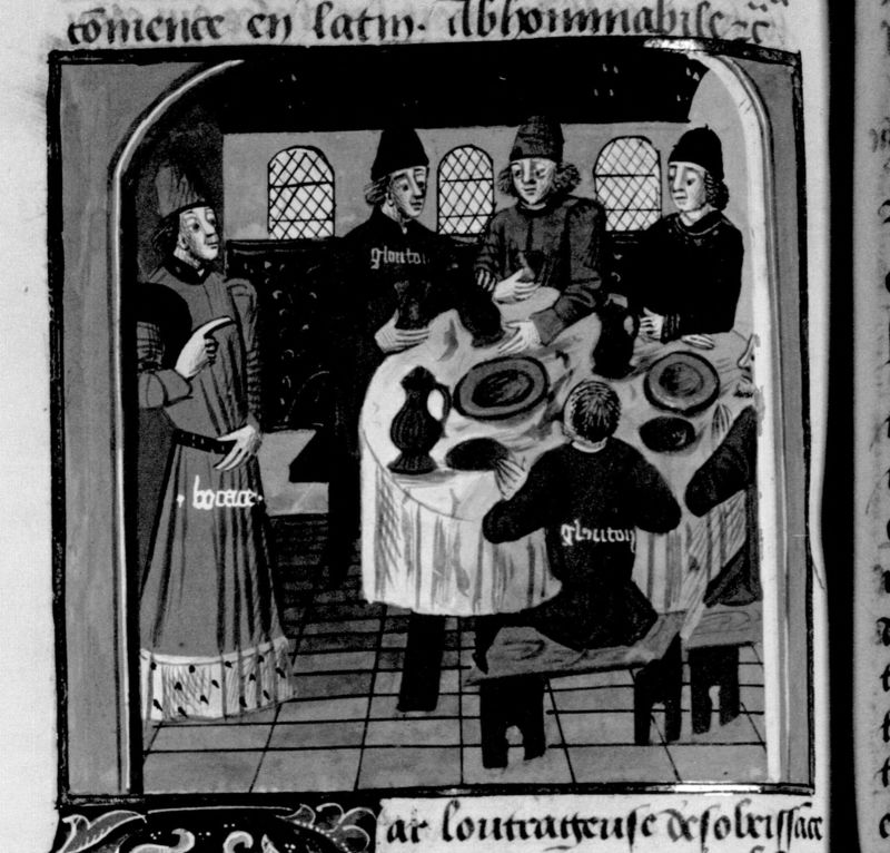 Parigi, Bibliothèque Nationale de France, Fr. 230, f. 203v. Il copista del manoscritto è P. Droulin. Giovanni Boccaccio condanna l'ingordigia di alcuni uomini che mangiano seduti a…