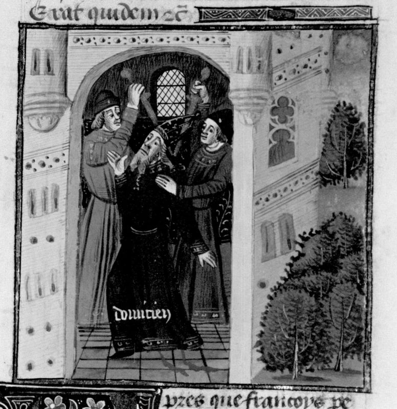Parigi, Bibliothèque Nationale de France, Fr. 230, f. 211r. Il copista del manoscritto è P. Droulin. L'imperatore Domiziano viene assassinato da due soldati.