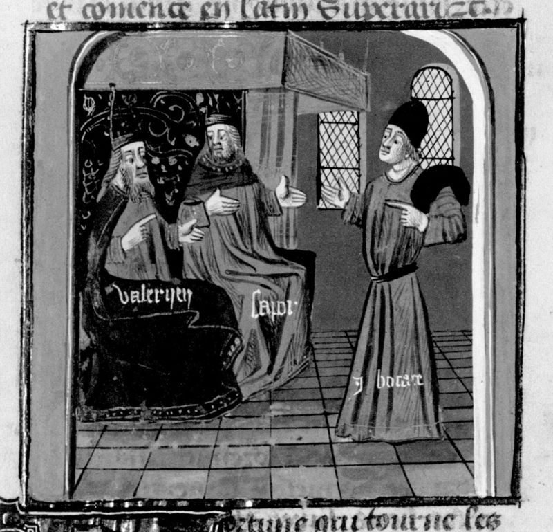 Parigi, Bibliothèque Nationale de France, Fr. 230, f. 214v. Il copista del manoscritto è P. Droulin. Giovanni Boccaccio incontra i re Sapore e Valeriano.