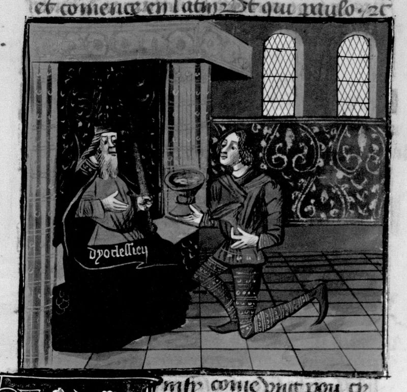 Parigi, Bibliothèque Nationale de France, Fr. 230, f. 219r. Il copista del manoscritto è P. Droulin. Un servitore offre una coppa avvelenata all'imperatore Diocleziano.