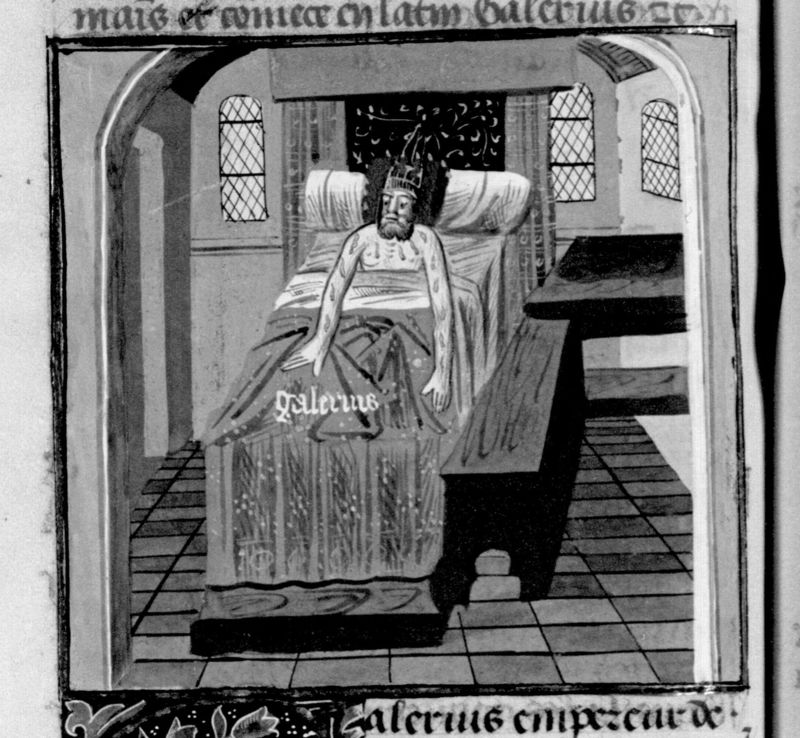 Parigi, Bibliothèque Nationale de France, Fr. 230, f. 221v. Il copista del manoscritto è P. Droulin. L'imperatore Galerio giace a letto morente colpito dalla cancrena.