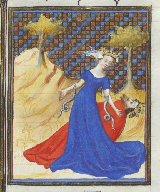 Chantilly, Bibliothèque du Château de Chantilly, 856, f. 46v. Medea, reggendo un mazzo di fiori ed una pergamena tra le mani, assiste mentre Giasone uccide il giovane Apsirto.
