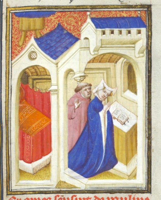 Chantilly, Bibliothèque du Château de Chantilly, 856, f. 111v. Paolina in preghiera sulla soglia del tempio; all'interno della camera da letto appare Dio Padre (?).