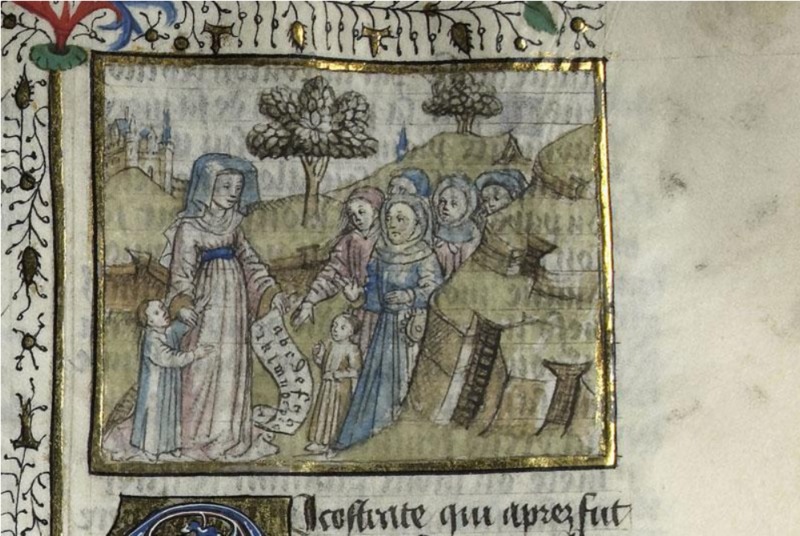 Chantilly, Bibliothèque du Château de Chantilly, 856, f. 53r. Carmenta insegna l'alfabeto ad un gruppo di uomini e bambini che emergono da una caverna.