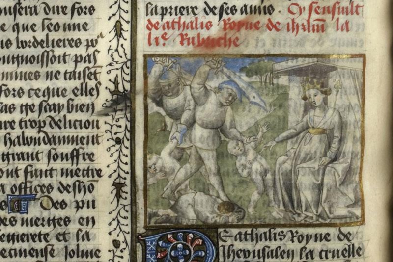 Chantilly, Bibliothèque du Château de Chantilly, 856, f. 78v. La regina Atalia ordina il massacro dei discendenti maschi della stirpe di David.