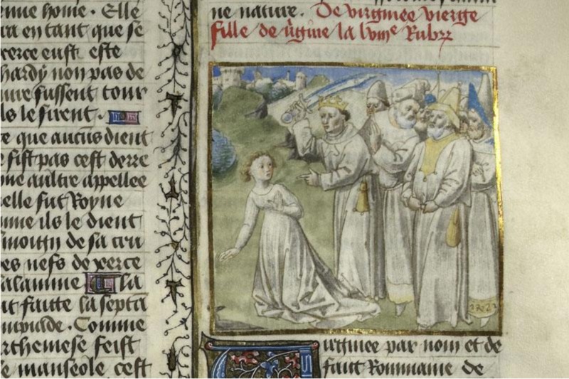 Bruxelles, Koninklijke Bibliotheek van België, 9509, f. 137r. Paolina, raccolta in preghiera dinanzi a un altare, viene corteggiata dal sacerdote Mondo.