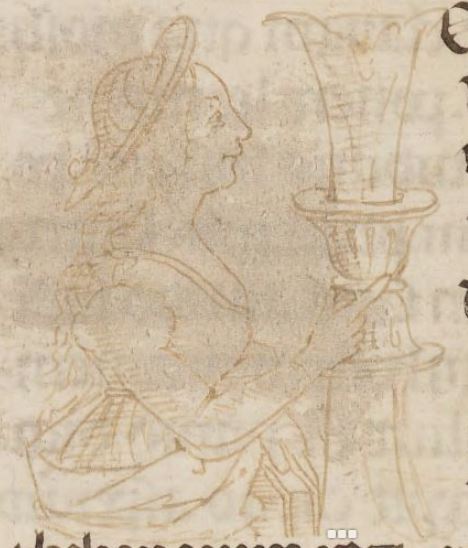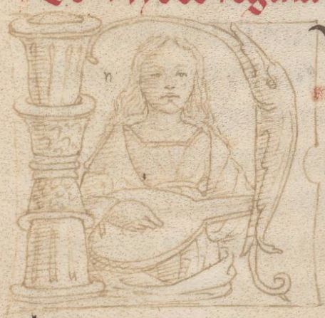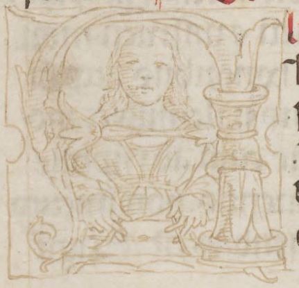 Cambridge (Mass.), Harvard University, Houghton Library, Richardson 41, f. 9r. Figura femminile, all'interno dell'iniziale figurata I(syphyles).