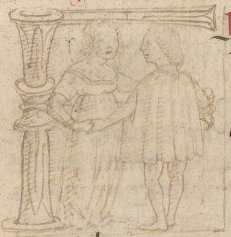 Cambridge (Mass.), Harvard University, Houghton Library, Richardson 41, f. 8v. Due giovani si tengono per mano (Flora ed Ercole oppure Flora e Zefiro?), all'interno dell'iniziale f…