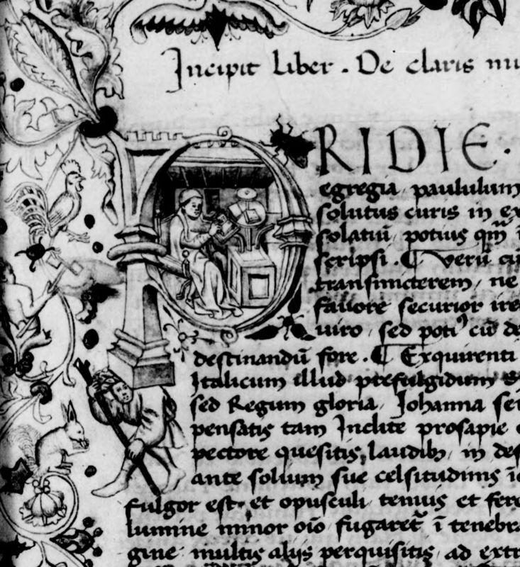 Oxford, Bodleian Library, Canon. misc. 58, f. 1v. Ritratto dell'autore Giovanni Boccaccio con un libro, all'interno dell'iniziale figurata P(ridie).