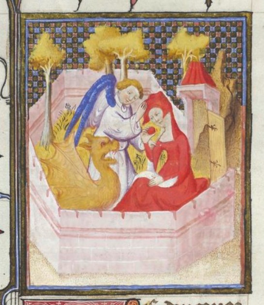 Bruxelles, Koninklijke Bibliotheek van België, 9509, f. 7r. Eva viene cacciata dal giardino dell'Eden per aver mangiato il frutto proibito; il serpente è raffigurato come un drago,…