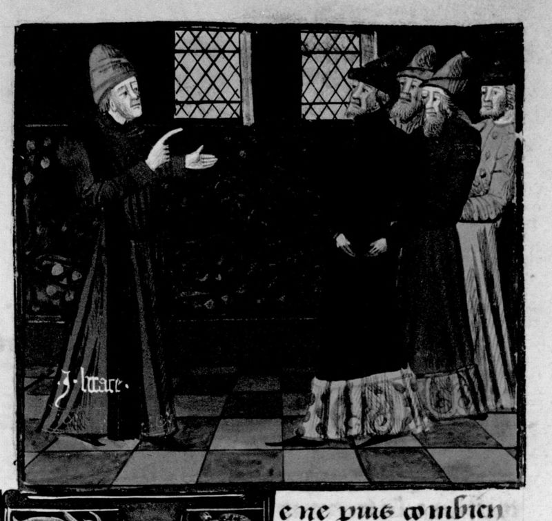 Parigi, Bibliothèque Nationale de France, Fr. 230, f. 81v. Il copista del manoscritto è P. Droulin. Giovanni Boccaccio incontra un gruppo di chierici e legisti.