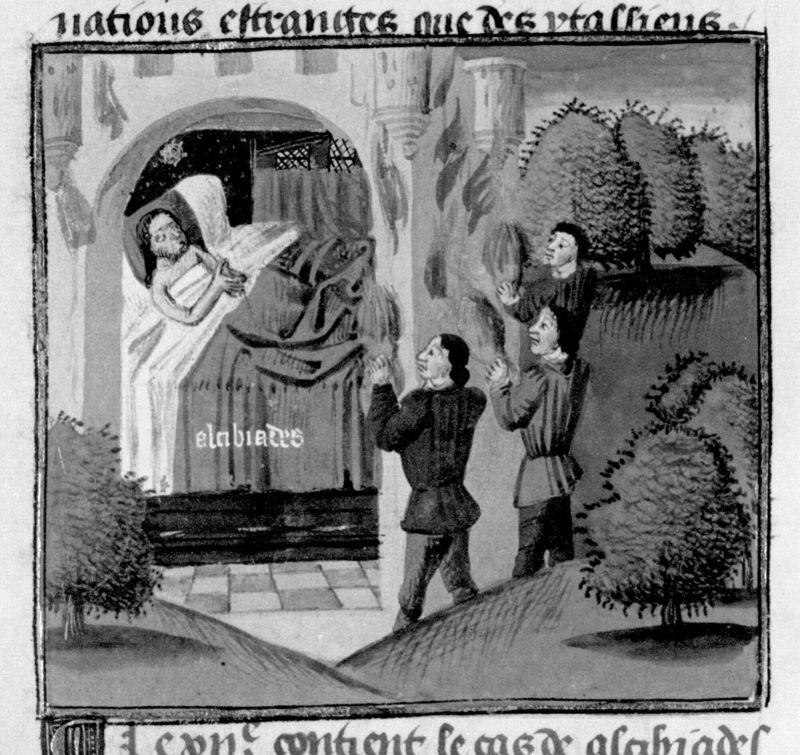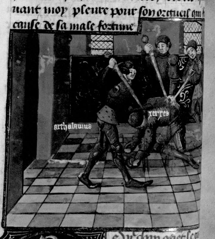 Parigi, Bibliothèque Nationale de France, Fr. 230, f. 74v. Il copista del manoscritto è P. Droulin. Artabano uccide Serse con l'aiuto di due uomini.