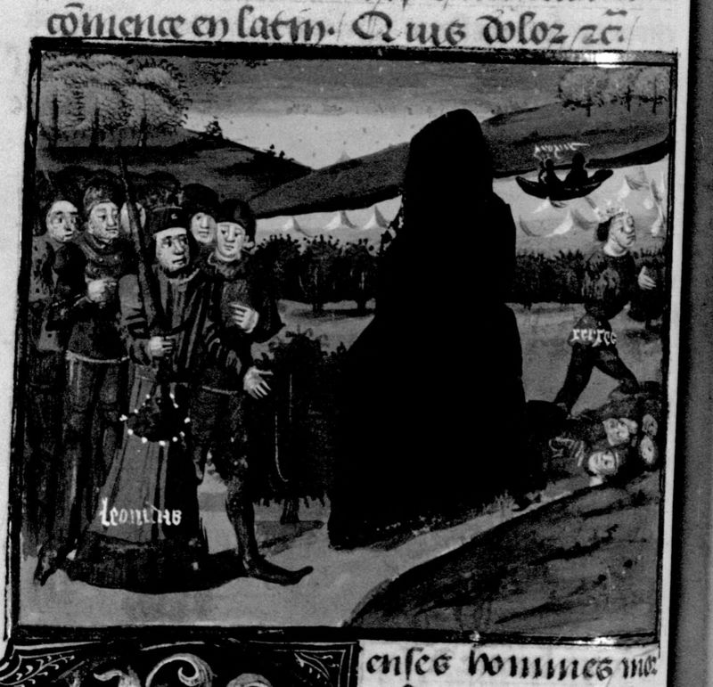 Parigi, Bibliothèque Nationale de France, Fr. 230, f. 76v. Il copista del manoscritto è P. Droulin. Serse, sconfitto e inseguito da Leonida, cerca il guado sull'Ellesponto; Serse a…