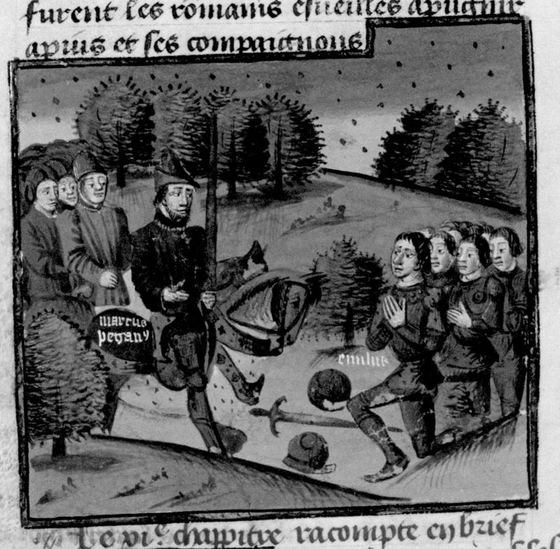 Parigi, Bibliothèque Nationale de France, Fr. 230, f. 82v. Il copista del manoscritto è P. Droulin. Equo Cluilio si arrende al tribuno Marco Geganio.