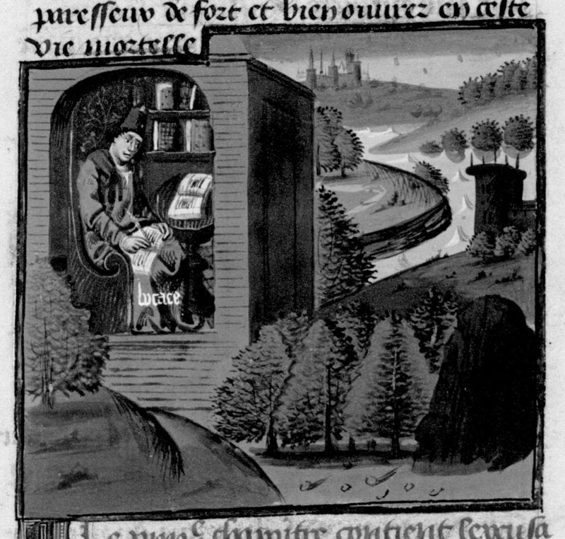 Parigi, Bibliothèque Nationale de France, Fr. 230, f. 86v. Il copista del manoscritto è P. Droulin. Giovanni Boccaccio siede nel suo studio intento a scrivere.