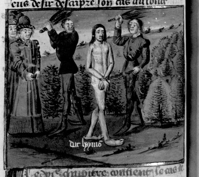 Parigi, Bibliothèque Nationale de France, Fr. 230, f. 88v. Il copista del manoscritto è P. Droulin. Annone viene frustato con delle verghe.