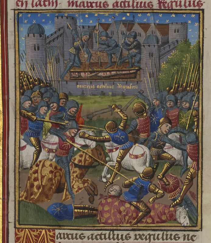 Parigi, Bibliothèque Nationale de France, Fr. 234, f. 40r. Gli eserciti dei romani e dei cartaginesi si affrontano sul campo di battaglia; Marco Attilio Regolo viene torturato tra …