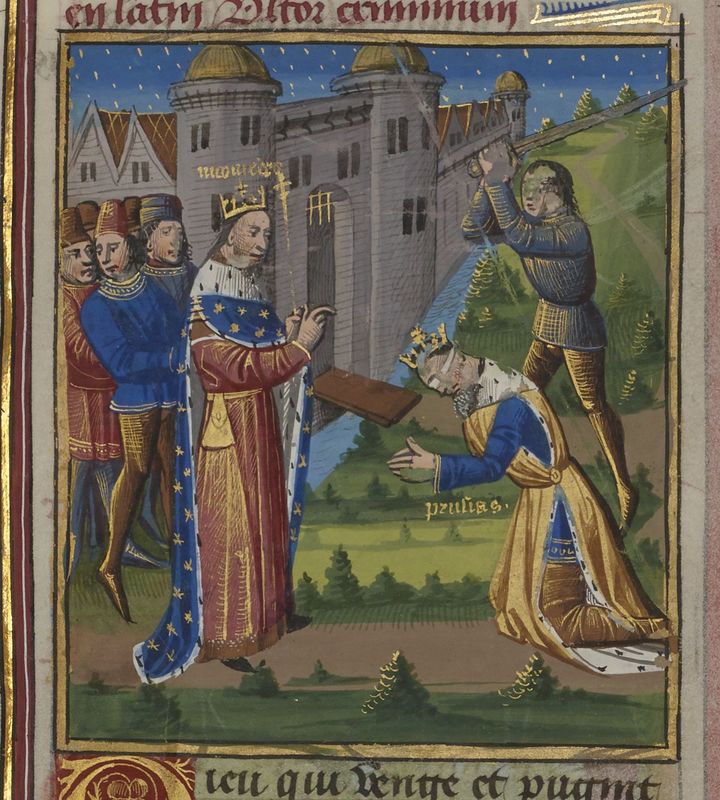 Parigi, Bibliothèque Nationale de France, Fr. 234, f. 56r. Re Nicomede ordina l'esecuzione del padre Prusia II di Bitinia.