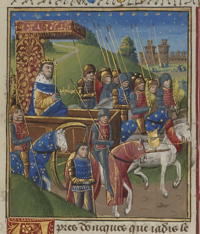 Parigi, Bibliothèque Nationale de France, Fr. 234, f. 144v. Zenobia viene portata prigioniera dinanzi all'imperatore durante il trionfo.