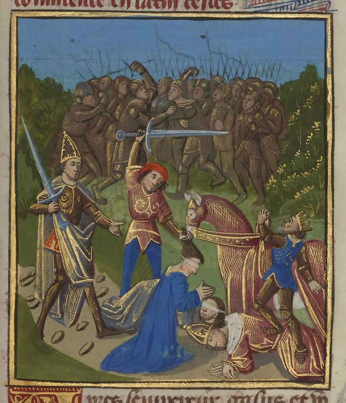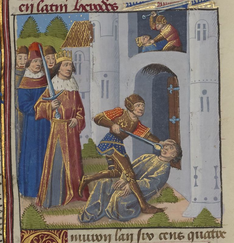 Parigi, Bibliothèque Nationale de France, Fr. 234, f. 62v. Demetrio II viene decapitato appena sbarcato sulle coste di Tiro.