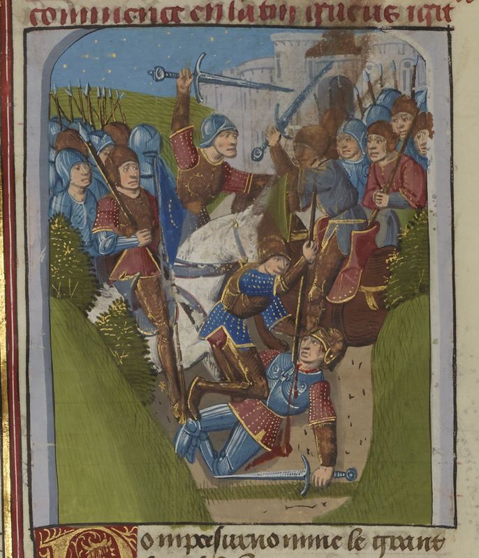 Parigi, Bibliothèque Nationale de France, Fr. 234, f. 86v. Lo scontro tra gli eserciti di Cesare e Pompeo.