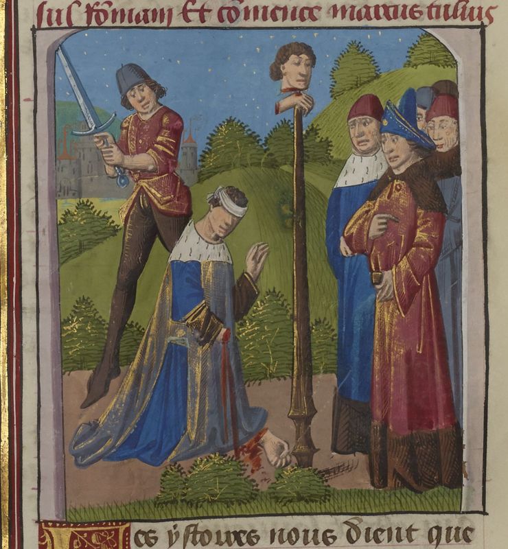 Parigi, Bibliothèque Nationale de France, Fr. 234, f. 97r. Cicerone, cui è stata amputata la mano destra, viene decapitato; la mano e la testa di Cicerone vengono esposte dinanzi a…