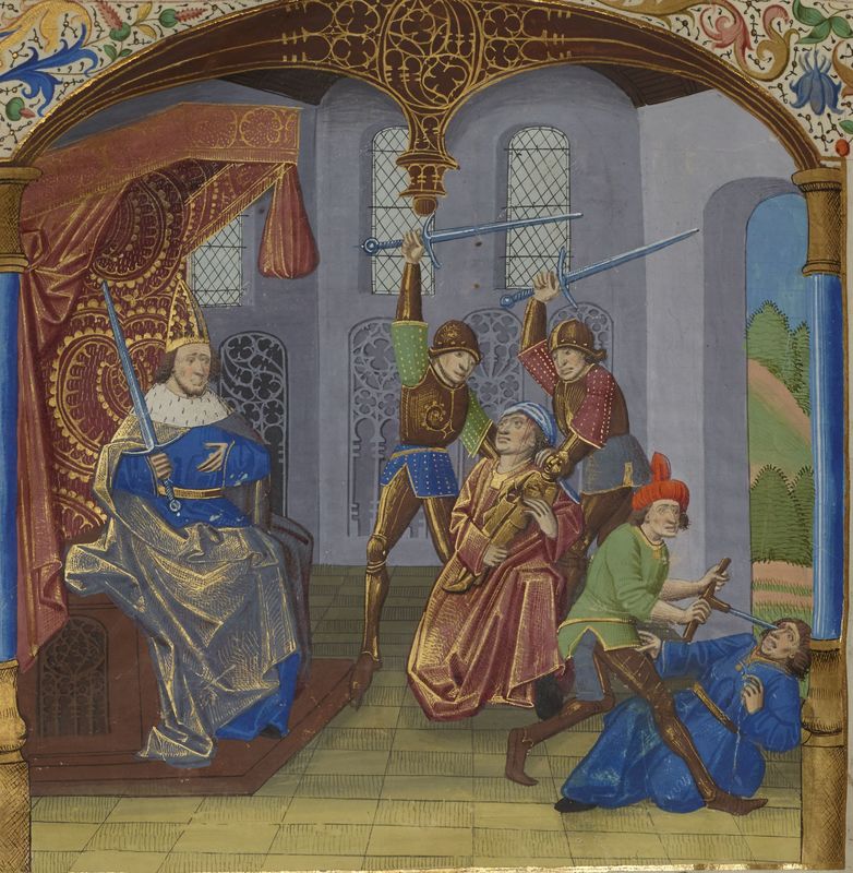 Parigi, Bibliothèque Nationale de France, Fr. 234, f. 64v. Re Gripo, seduto sul trono, ordina a tre soldati di assassinare Alessandro Zebenna.