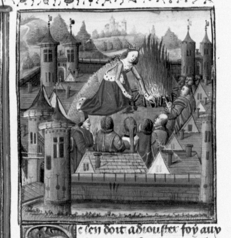 Parigi, Bibliothèque Nationale de France, Fr. 233, f. 43v. Il popolo cartaginese assiste al suicidio di Didone, che salita sulle mura della città si pugnala e si getta sulla pira f…