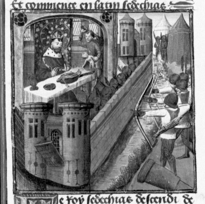 Parigi, Bibliothèque Nationale de France, Fr. 233, f. 51v. Sedecia, assediato all'interno delle mura di Gerusalemme, assiste al massacro dei suoi figli.