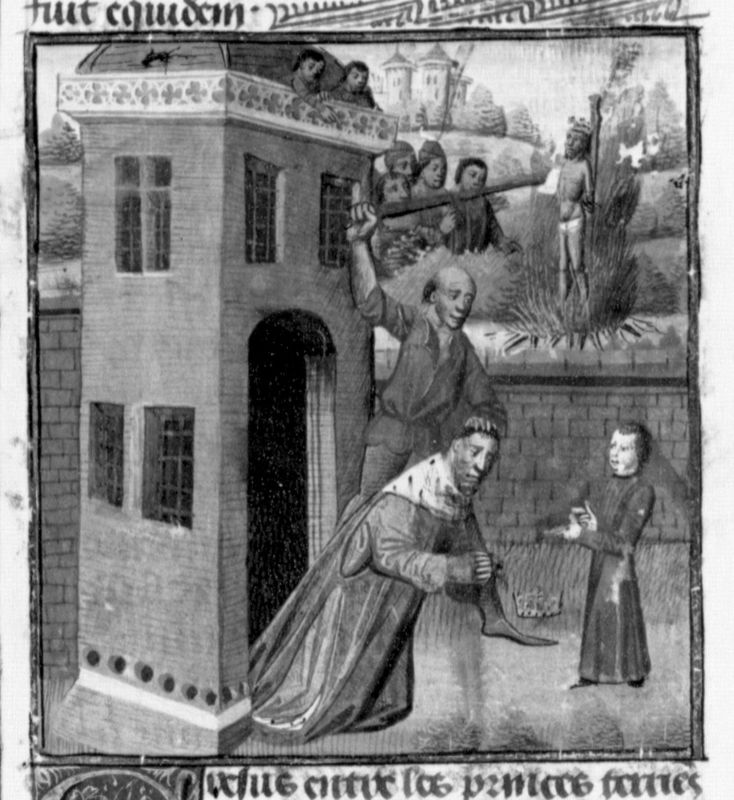 Parigi, Bibliothèque Nationale de France, Fr. 234, f. 16v. Lo scontro tra gli eserciti di Antigono e Eumene; Re Eumene rinchiuso in catene in prigione.