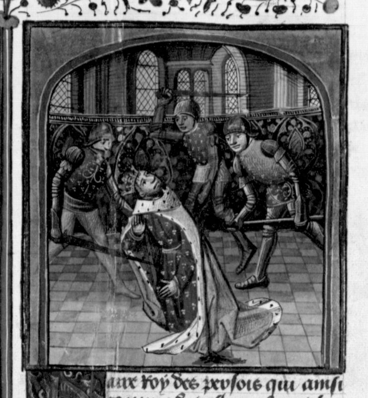 Parigi, Bibliothèque Nationale de France, Fr. 233, f. 80r. Serse viene assassinato nel palazzo dalle sue guardie.