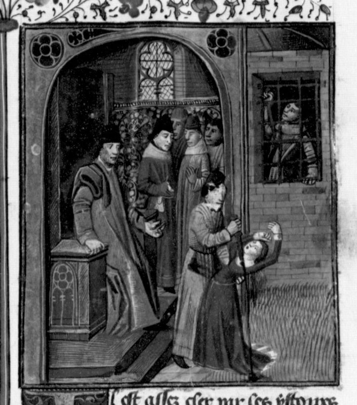 Parigi, Bibliothèque Nationale de France, Fr. 233, f. 85r. Virginio uccide la figlia Virginia per sottrarla alla schiavitù; Appio Claudio rinchiuso in prigione.