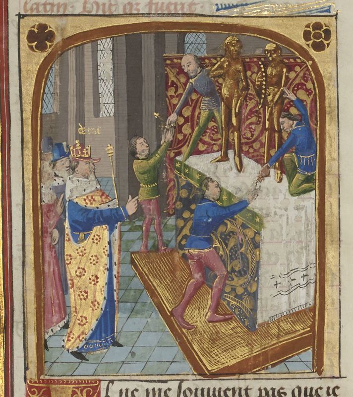 Parigi, Bibliothèque Nationale de France, Fr. 234, f. 5r. Dionigi di Siracusa ordina ai suoi uomini di spogliare le statue del tempio dei loro tesori.