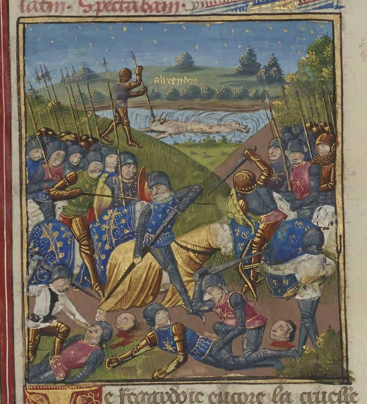 Miniatore francese (1450-1475), Lo scontro tra due eserciti; un uomo recupera il cadavere di Alessandro I