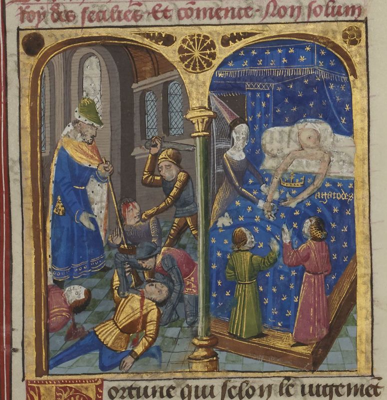 Parigi, Bibliothèque Nationale de France, Fr. 234, f. 36v. La morte di Beronice, moglie di Antioco II, e di uno dei suoi figli; Antioco viene assassinato (errore).
