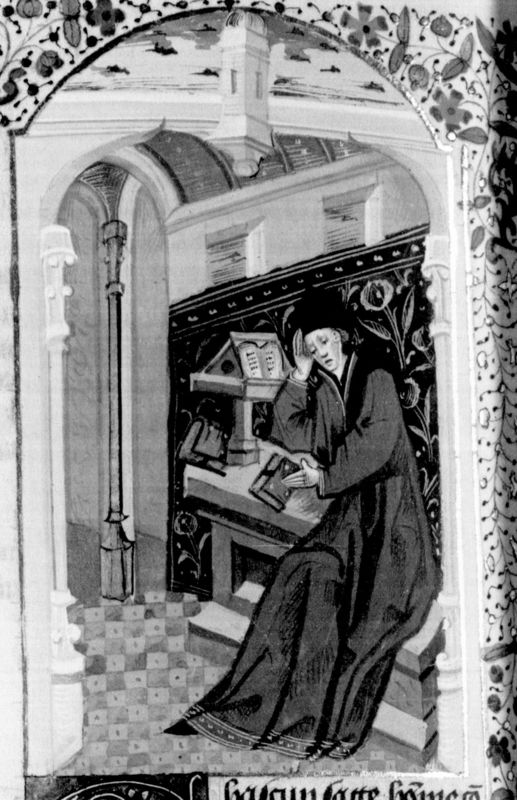 Parigi, Bibliothèque Nationale de France, Fr. 232, f. 222v. L'autore Giovanni Boccaccio seduto accanto ad un leggio.