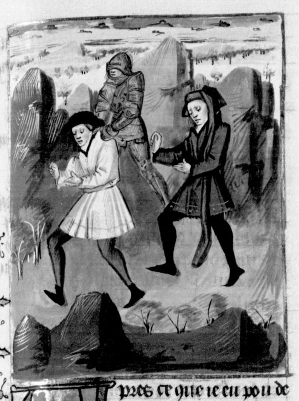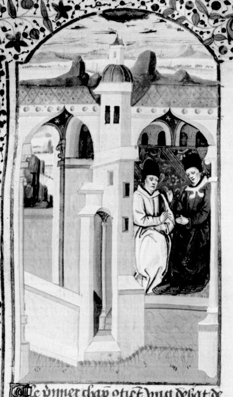 Parigi, Bibliothèque Nationale de France, Fr. 232, f. 230v. Giovanni Boccaccio incontra due uomini.