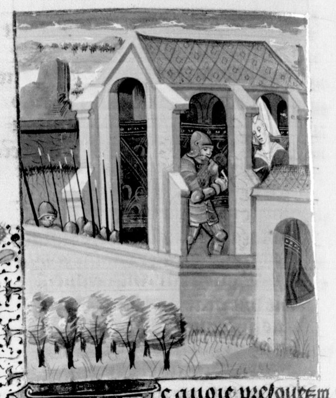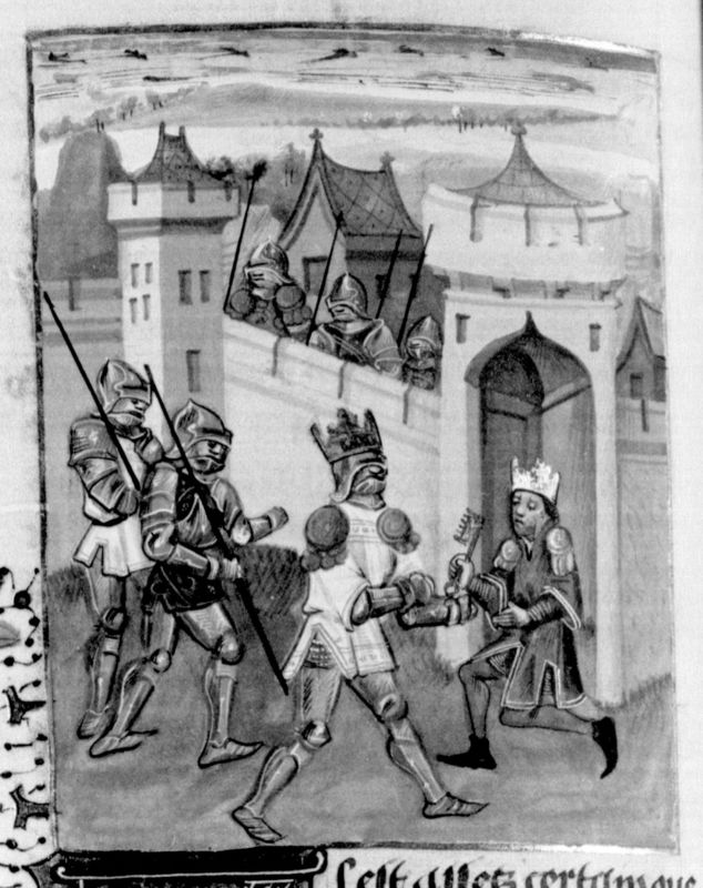 Parigi, Bibliothèque Nationale de France, Fr. 232, f. 187v. Demetrio II Nicatore viene catturato dai Parti e condotto prigioniero in città.
