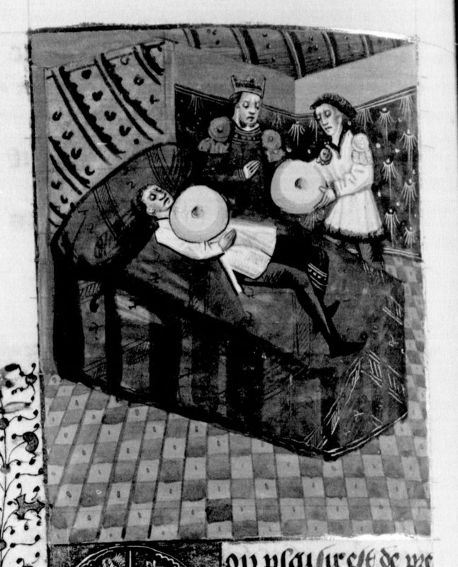 Parigi, Bibliothèque Nationale de France, Fr. 232, f. 164v. Tolomeo Filopatore muore tra le braccia della sua concubina.