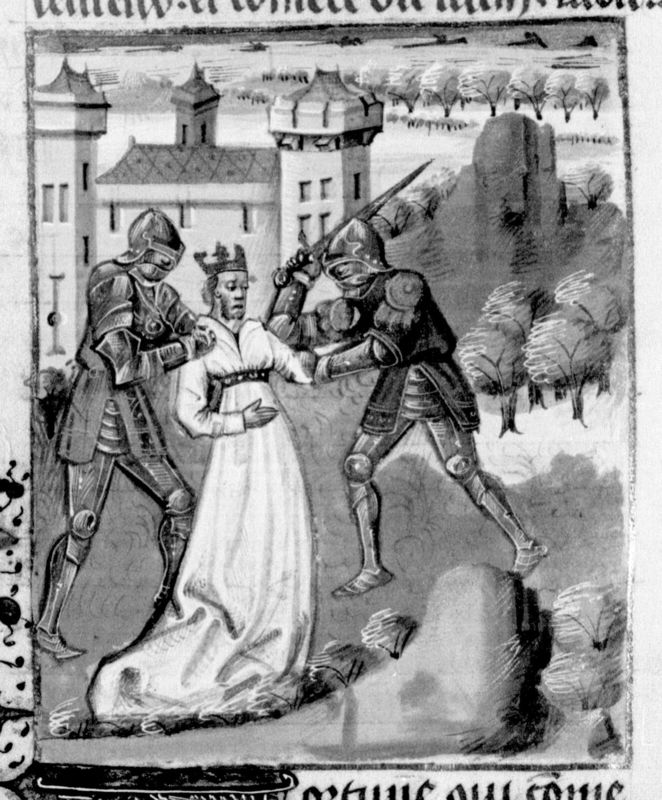 Parigi, Bibliothèque Nationale de France, Fr. 232, f. 157v. Deidamia, rifugiatasi nel tempio di Diana, viene raggiunta da Milone e uccisa.