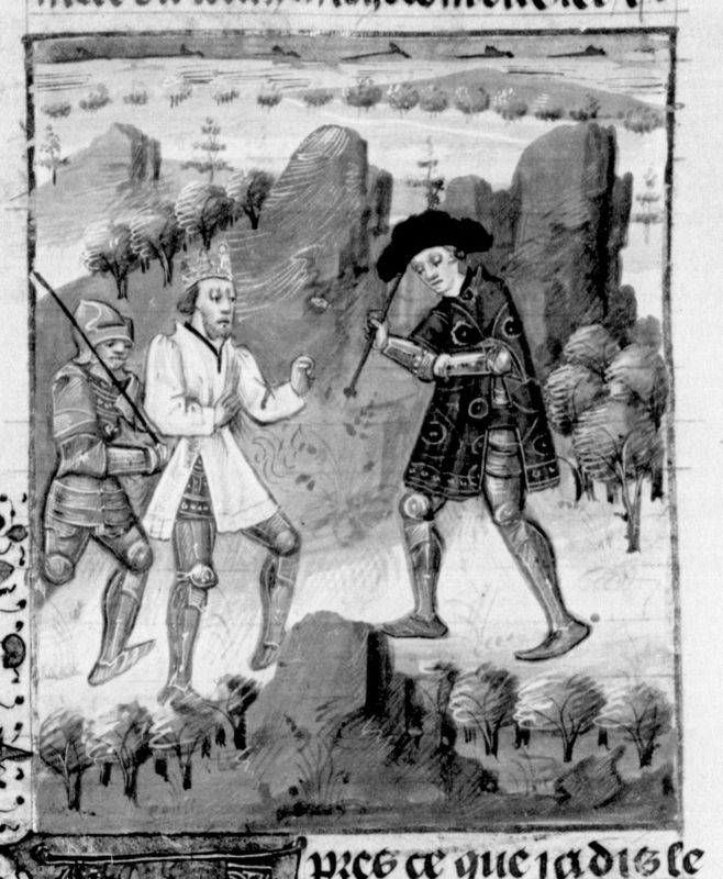 Parigi, Bibliothèque Nationale de France, Fr. 232, f. 191r. Bituito, re degli Arverni, viene condotto in prigione.