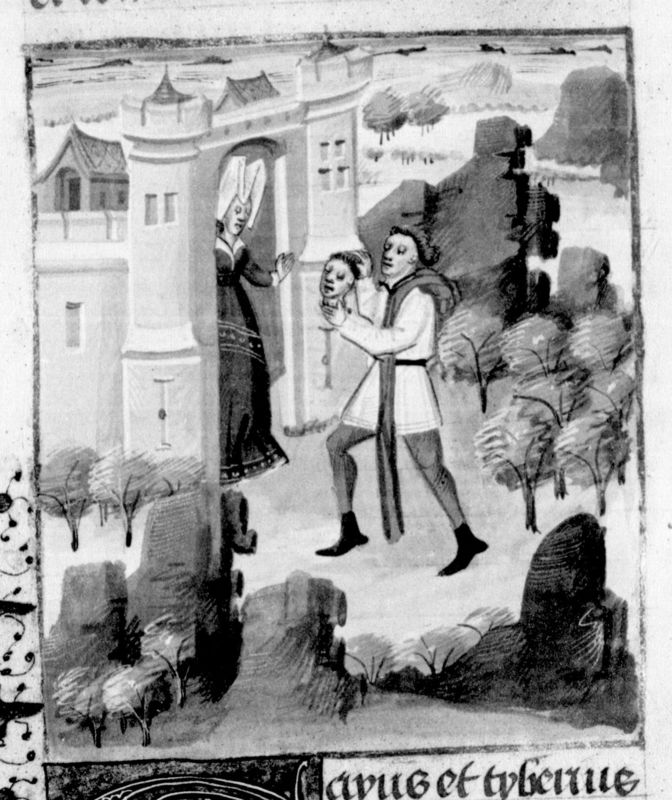 Parigi, Bibliothèque Nationale de France, Fr. 232, f. 185v. Un uomo porta la testa di Caio Sempronio Gracco alla madre Cornelia.