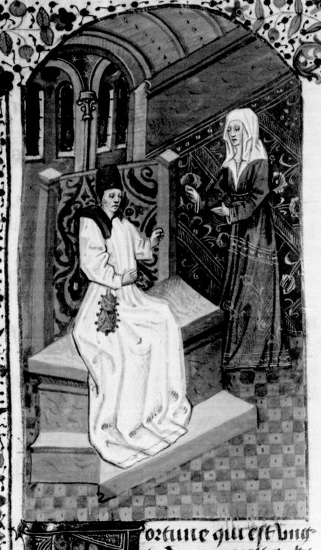 Parigi, Bibliothèque Nationale de France, Fr. 232, f. 195v. La Fortuna appare a Giovanni Boccaccio.