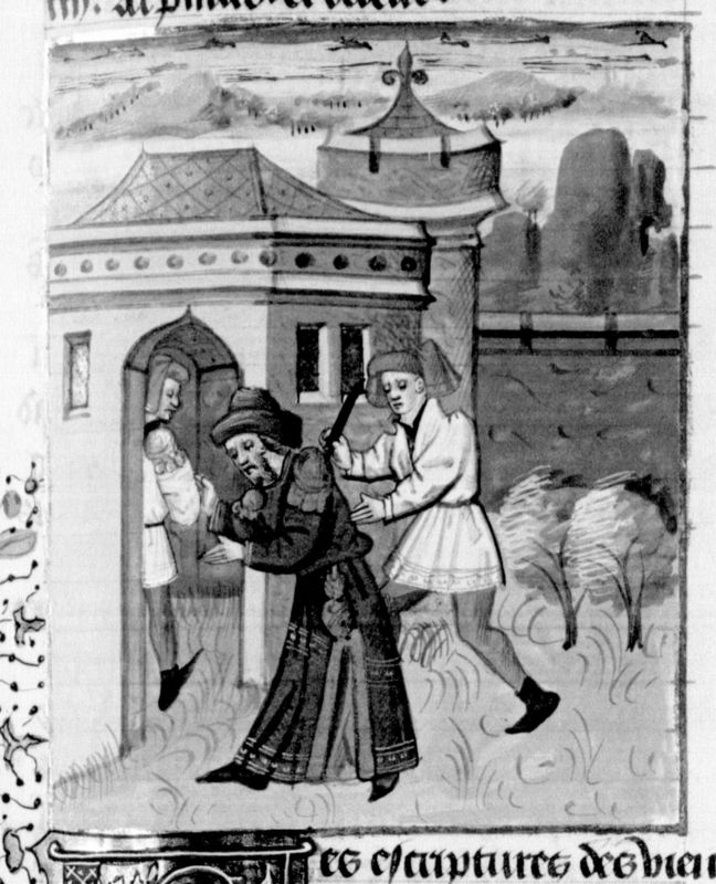 Parigi, Bibliothèque Nationale de France, Fr. 232, f. 201r. Un uomo viene condotto in prigione.