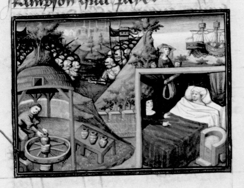 Parigi, Bibliothèque Nationale de France, Fr. 235, f. 158v. Sul letto di morte Agatocle ordina alla moglie e ai figli di fuggire in Egitto; un uomo lavora al tornio; due eserciti s…
